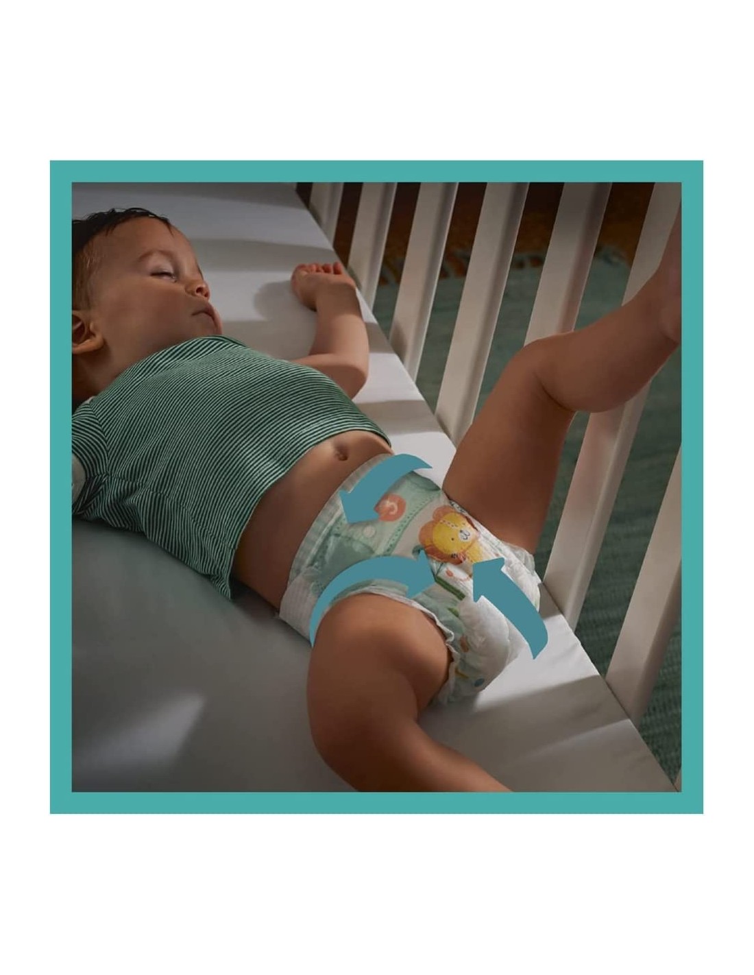Les couches Pampers Baby-Dry offrent jusqu'à 12H de protection anti-fuites.